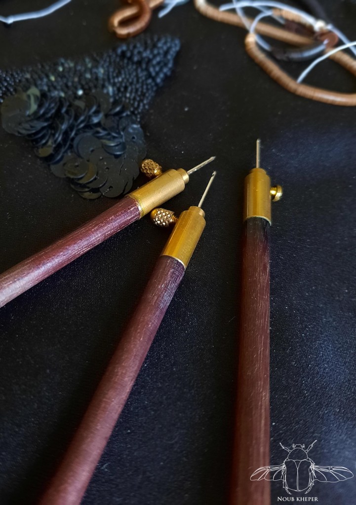 On enfile les fournitures (perles et paillettes) à l’avance. On travaille ensuite à partir de l’envers du tissu (soierie, velours, mousseline, …). Le crochet traverse l’étoffe, fixe la pièce sur l’endroit et ressort sur l’envers, en formant une boucle.