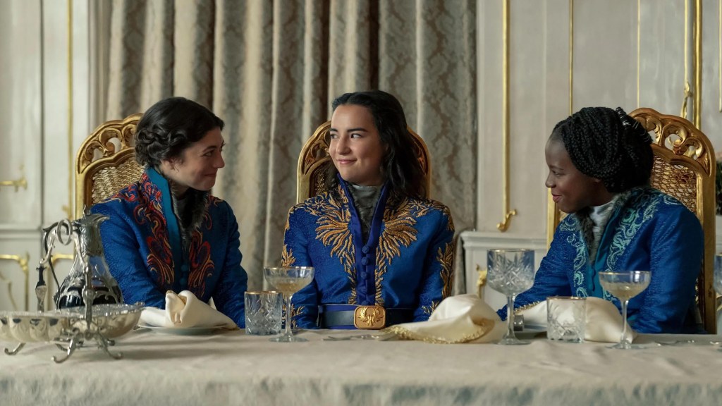 La série est remplie de broderie magnifique! Les Grisha, les magiciens de ce monde, portent des manteaux somptueusement brodés. On y voit de la pose de cannetille mate, lisse et frisée, pour un jeu de lumière et de texture. Les techniques s’approchent des broderies militaires, avec des formes ornementales et organiques. Très souvent, on retrouve du passé plat droit et du passé plat biais de différentes cannetilles.