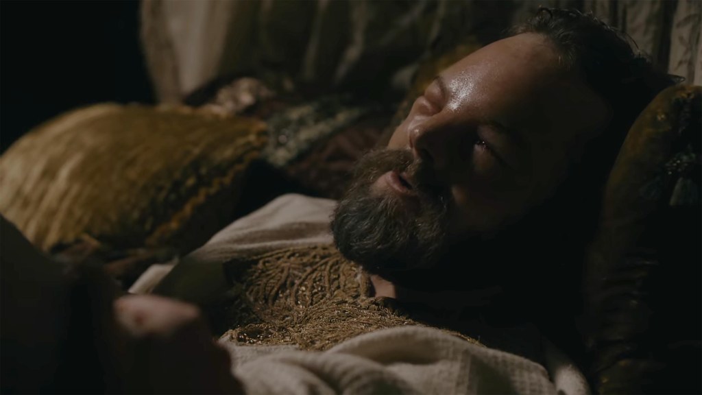 La mort du roi Æthelwulf. Dans cette scène, le personnage porte un vêtement fortement brodé au fil d’or. On peut apercevoir de la pose de cannetille en passé plat, des points de tige, ainsi que quelques paillettes.