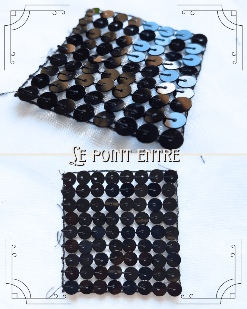 Il peut s’effectuer avec des paillettes (plate), des sequins (trou décalé) ou des cuvettes (comme sur l’image).