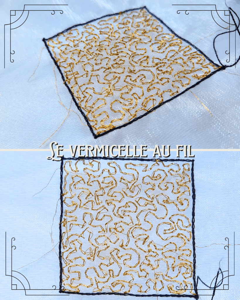 Le vermicelle, c’est quoi ? C’est une technique de remplissage où le crochet tourne pour éviter les lignes droites et les angles. Le mien n’est pas très joli, mais ça fonctionne quand même :).