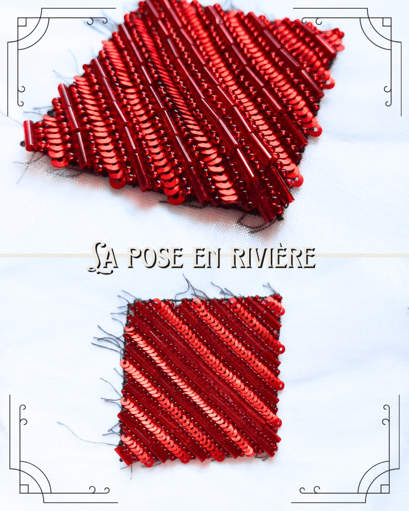 Contrairement à la pose en rivière, ici on va faire un point sans fourniture entre deux paillettes. Cela donne la place à la paillette de bien se placer et de se voir.