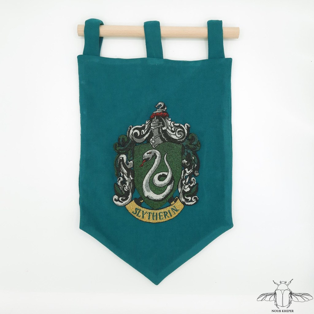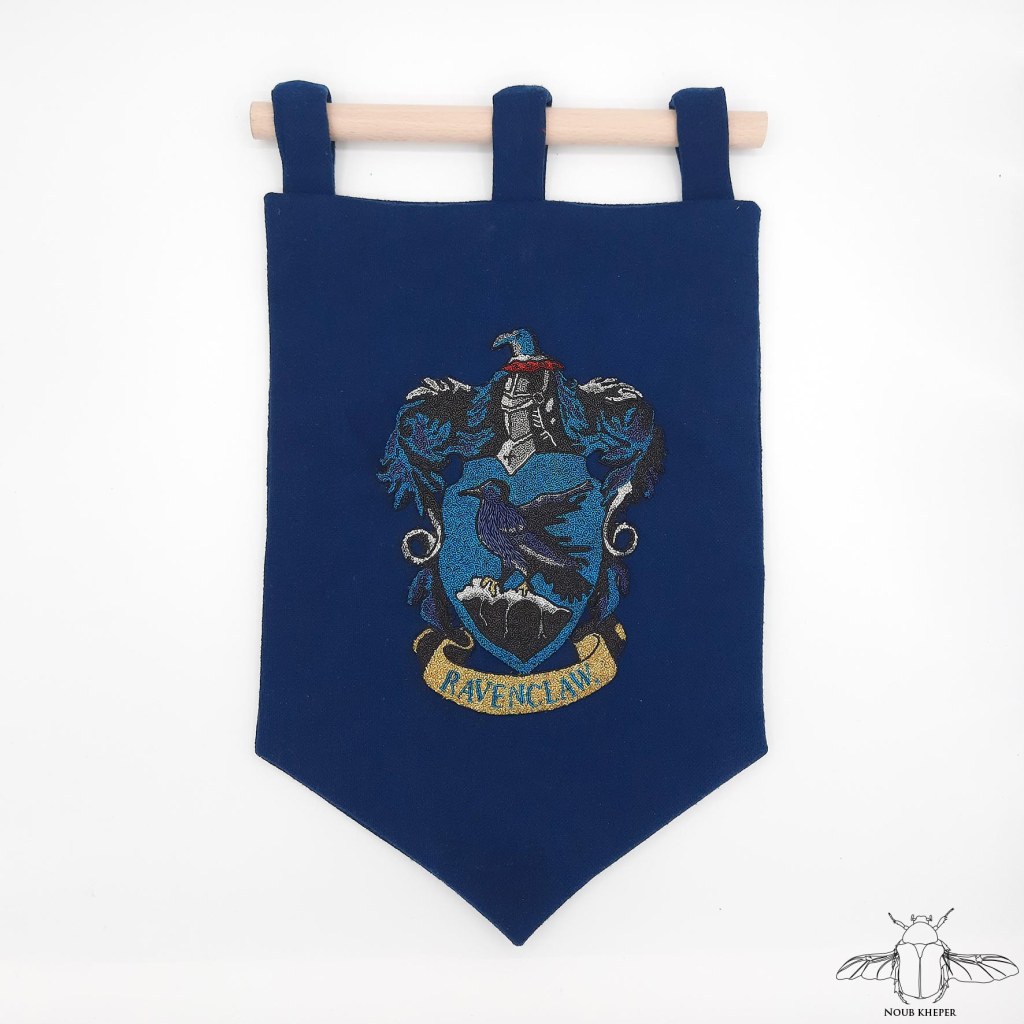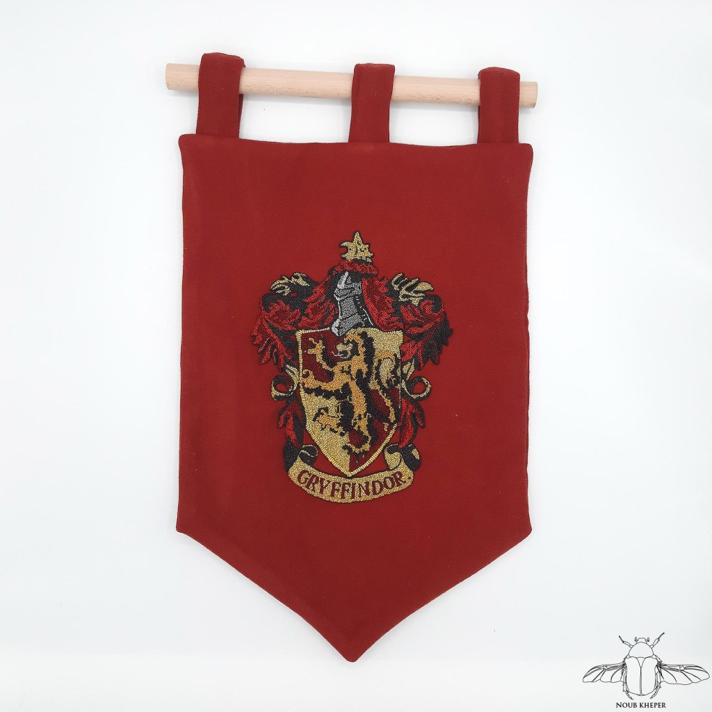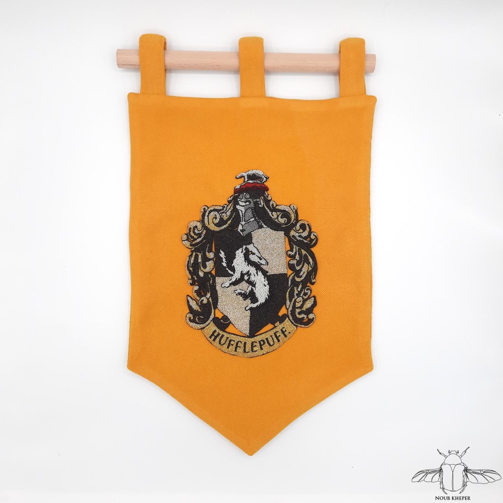 Pour avoir une continuité, les blasons gardent leur banderole en cannetille or. Ils font tous une taille A5 (la partie brodée) et sont plaqués sur un textile au couleur de chaque maison.