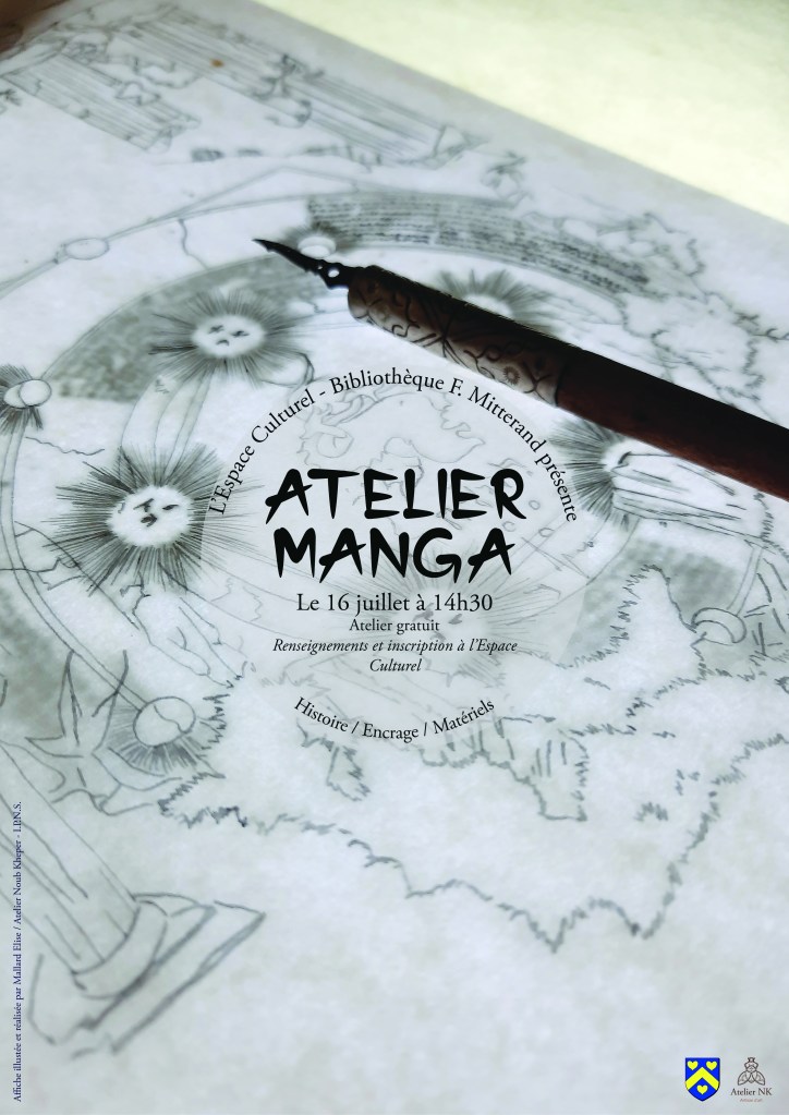 Durant le mois sur le Japon, j’ai également animé un atelier autour de l’encrage et du manga. Voici, l’affiche associée.