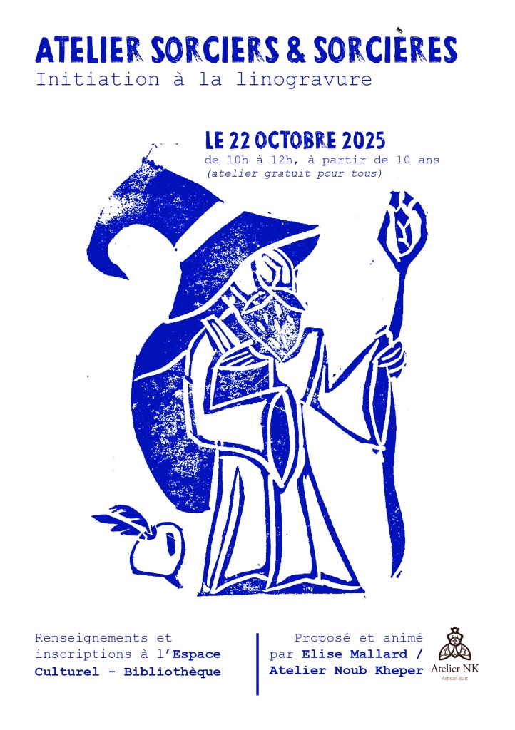 Octobre 2025 – affiche réalisée pour promouvoir mon atelier de linogravure sur le thème des sorciers et sorcières.